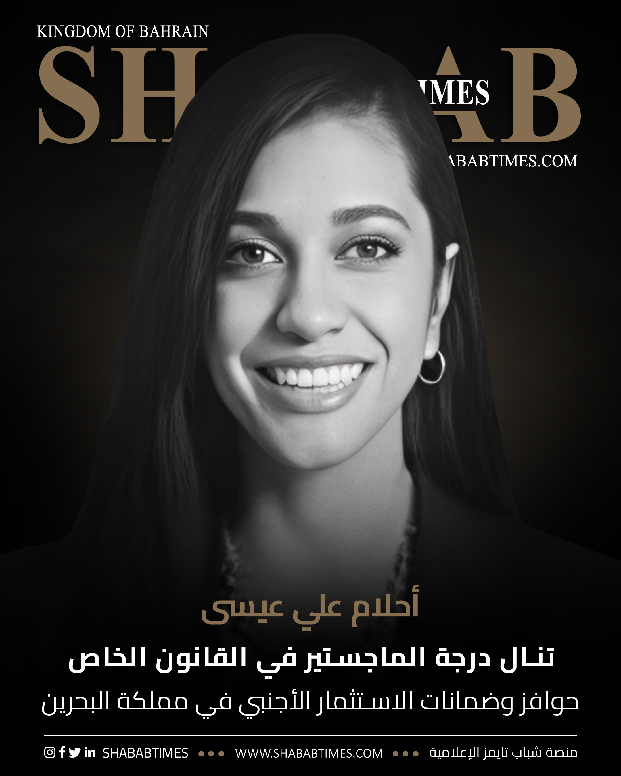 تخرجت الطالبة أحلام علي عيسى من برنامج الماجستير في القانون الخاص بجامعة البحرين، وذلك بعد نجاحها في مناقشة أطروحتها البحثية الموسومة بعنوان: «حوافز وضمانات الاستثمار الأجنبي في مملكة البحرين - دراسة مقارنة» تحت إشراف الأستاذ الدكتور غالب البلوشي.