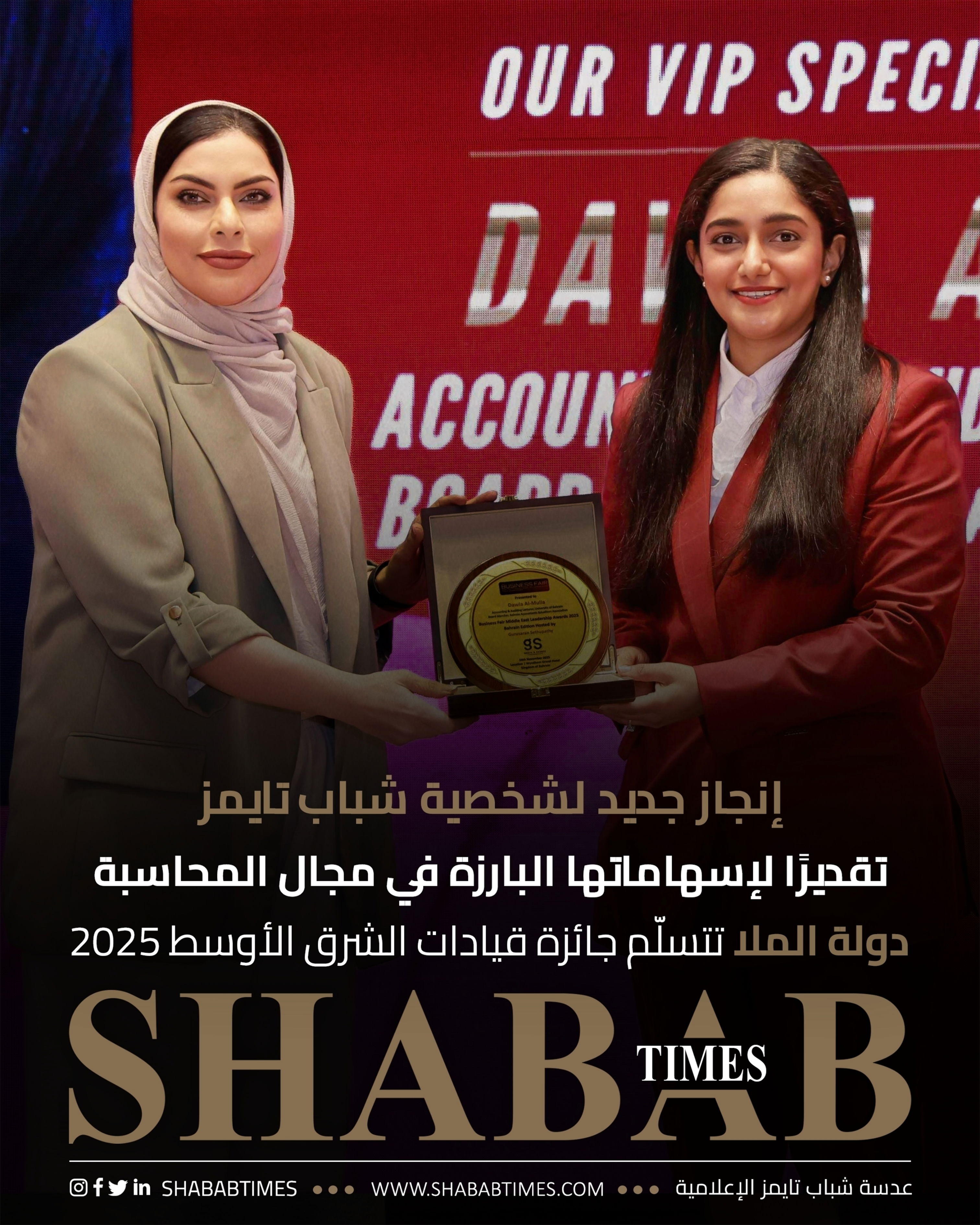 تسلّمت شخصية شباب تايمز السيدة دولة الملا، عضو هيئة التدريس في جامعة البحرين وعضو مجلس إدارة جمعية المحاسبين والمراجعين البحرينية، جائزة القيادة في الشرق الأوسط لعام 2025، وذلك خلال الحفل الذي أُقيم ضمن فعالية معرض الأعمال - النسخة البحرينية، تقديرًا لإسهاماتها البارزة في مجال المحاسبة وتطوير الممارسات المهنية.